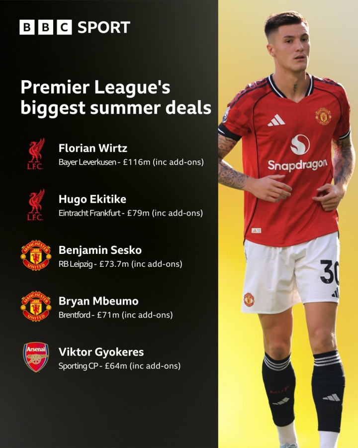 英超夏窗引援排行:(含附加条款)